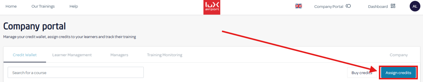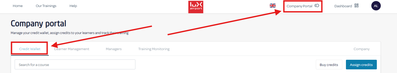 1) Click on "Company Portal" then "Credit Wallet" 2) Click on "Buy credits" button 3) Create your training list with the “Add to list” button, select your payment method, then click on "Buy credits".