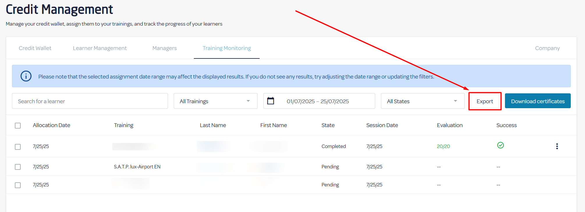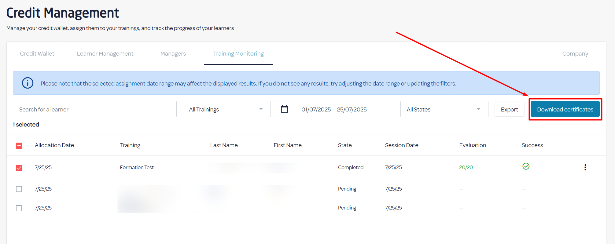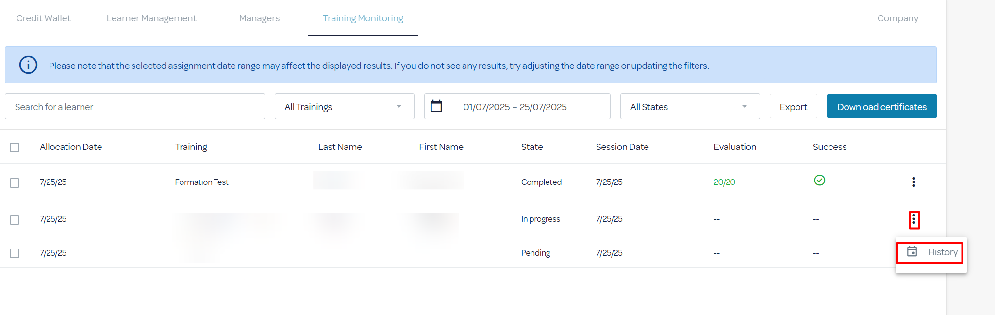 1) Go to the business area 2) Click on “Learner Management” then on “Monitoring” tab. 3) By clicking on the three dots on the right, you can view the history of a training as soon as the progress status is "In progress" and download its certificate ...