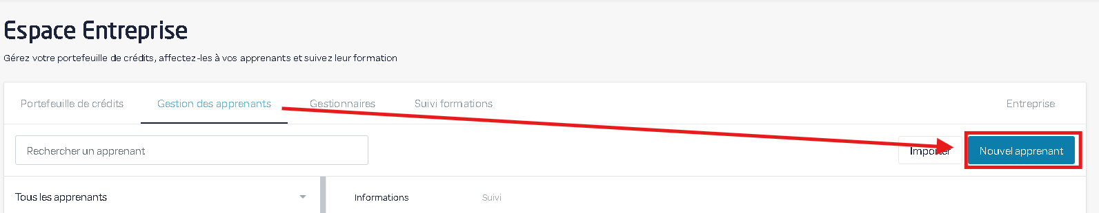 1) Rendez-vous dans "Espace entreprise". 2) Cliquez sur l'espace "Gestion des apprenants" 3) Sélectionner l'apprenant que vous souhaitez modifier dans la liste sur la gauche, ou cherchez le avec l'outil de recherche. 4) Modifier les informations et ...