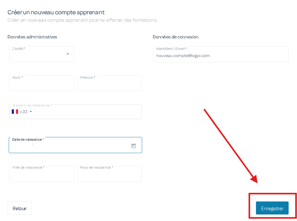 4) Remplissez les informations du nouvel apprenant et enregistrez.
