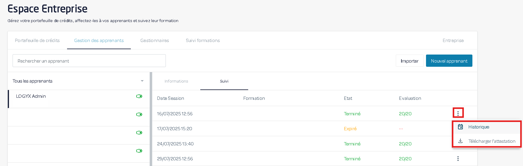 3) En cliquant sur les trois points à droite, vous pouvez consulter l'historique d'une formation dès que son statut est « En cours » et télécharger l'attestation lorsque son statut est « Terminée ».