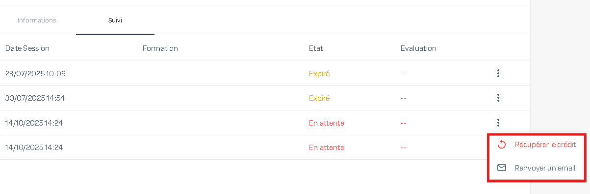 Lorsque le statut est « en attente », vous pouvez récupérer le crédit ou renvoyer l'email d'attribution à l'apprenant.