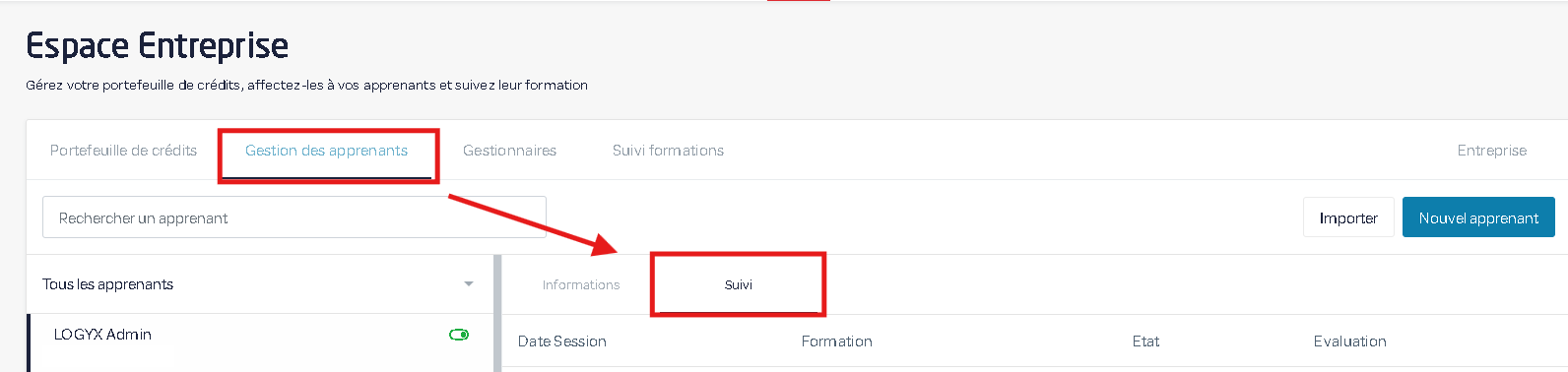 2) Cliquez sur "Gestion des apprenants" puis sur "Suivi".