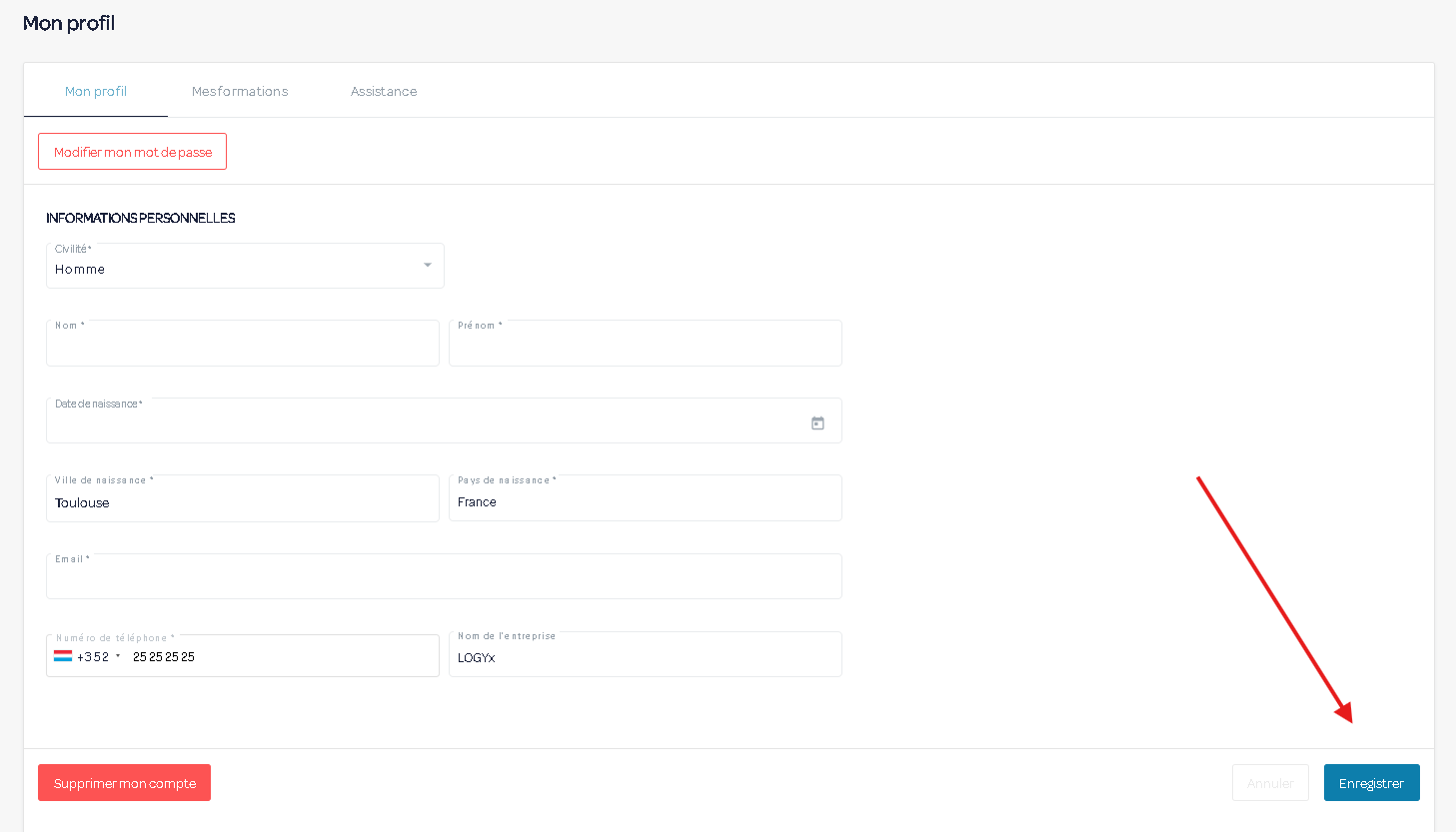 3) Modifiez vos informations puis sauvegardez-les en cliquant sur Enregistrer
