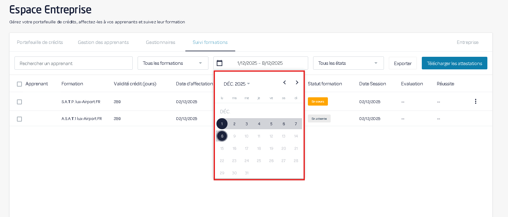 3) Vous pouvez sélectionner des dates pour réduire l'affichage des formations affectées entre celles-ci.
