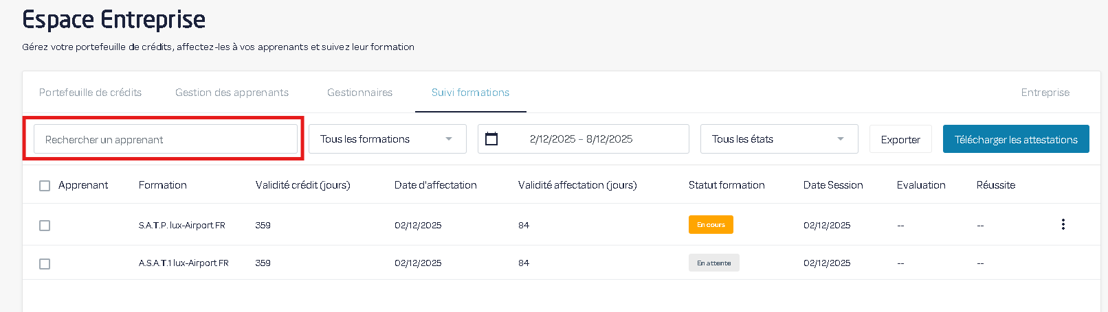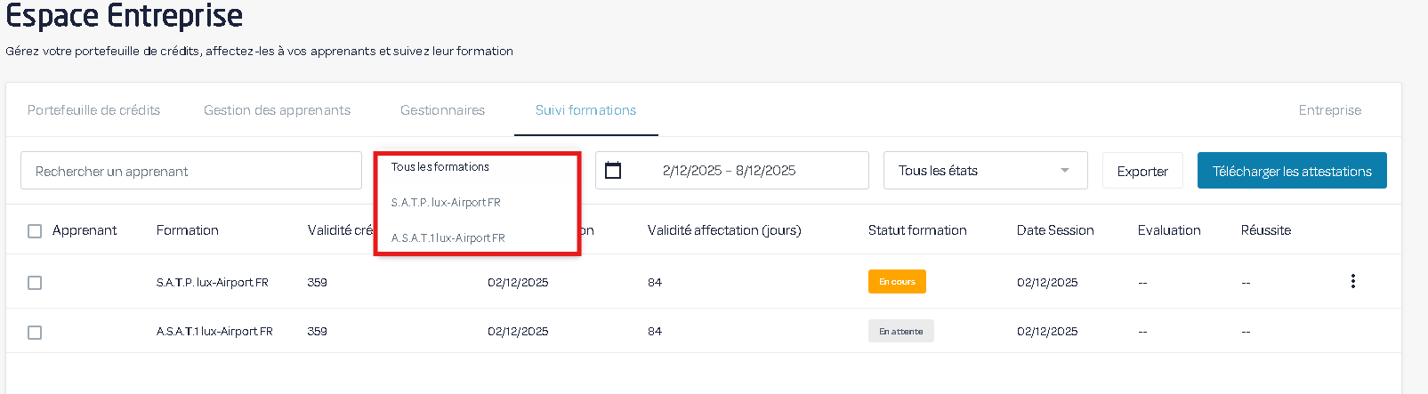 2) Vous pouvez sélectionner une formation pour afficher uniquement les agents à qui elle a été affectée.