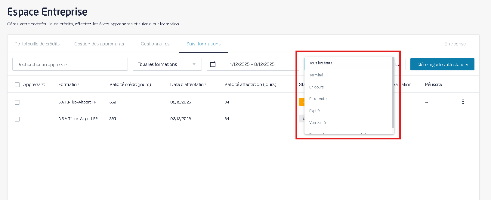 4) Vous pouvez sélectionner un état pour afficher seulement les formations dans un certain état d'avancement.